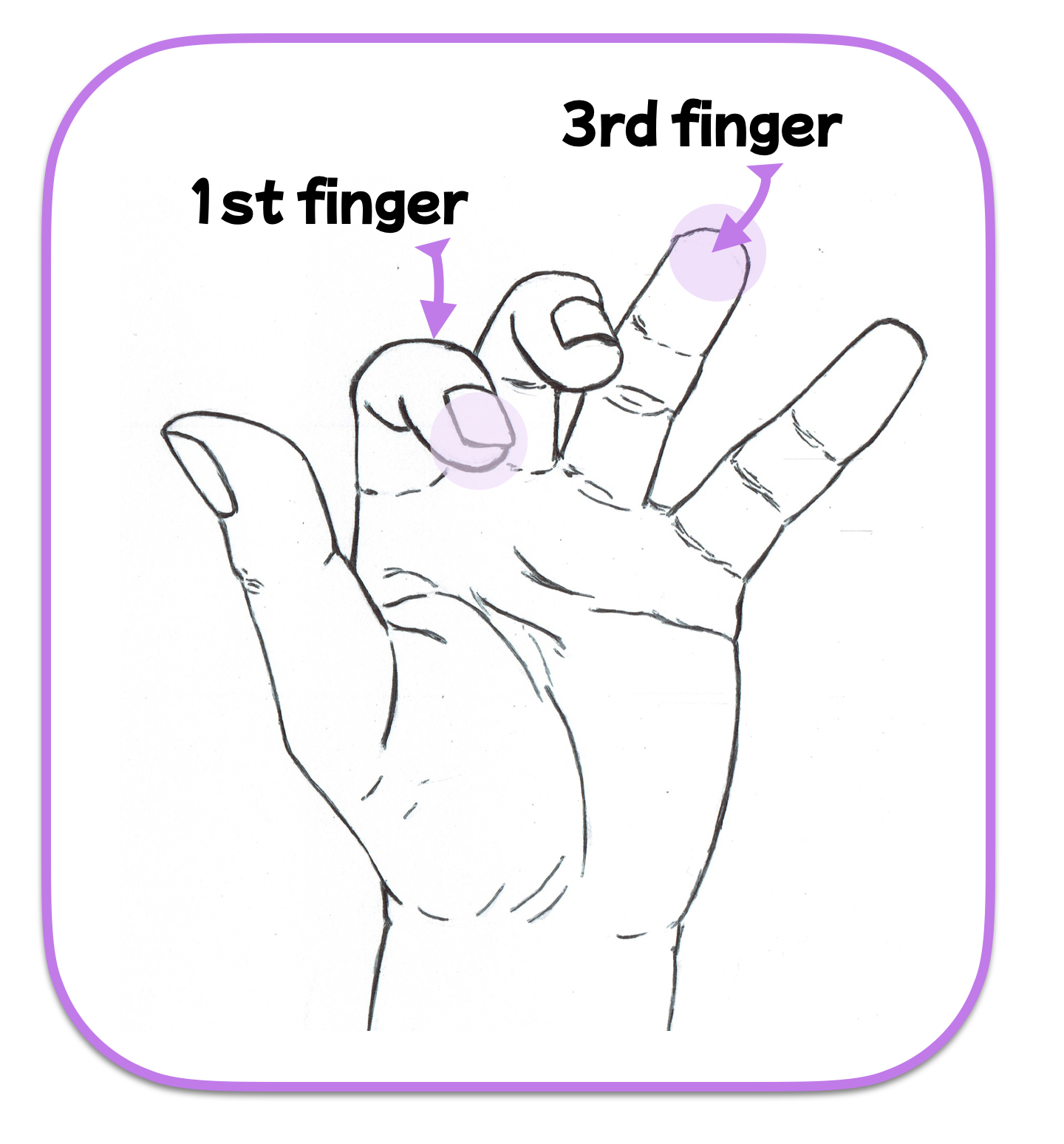 Check out the diagram below, this is an overhead shot looking down at your guitar. The 3rd finger is pressing down on the 1st E string or the skinniest string. The thumb is positioned in the middle of the neck so that your fingers can curl over like a cats claw. This makes it easier to for your fingertips to press down onto the strings